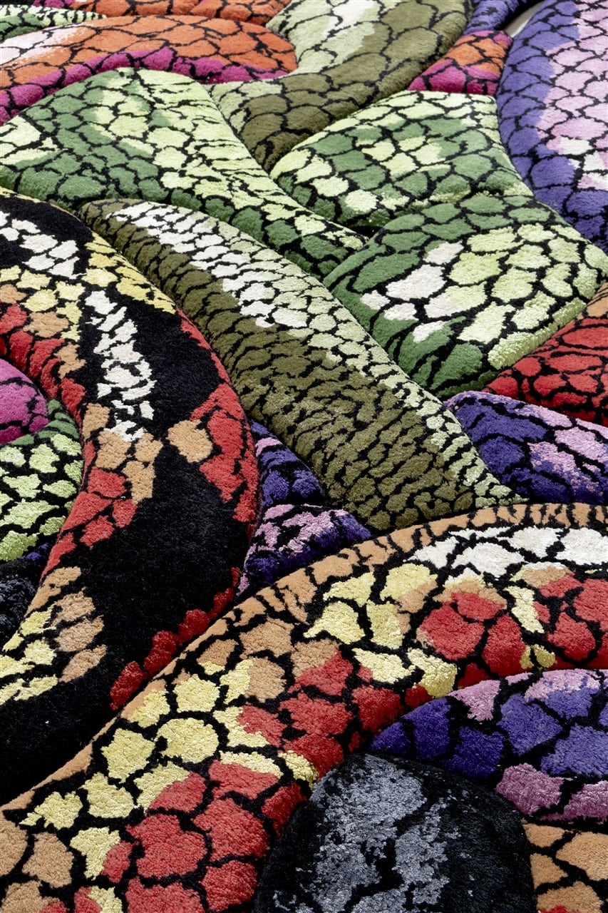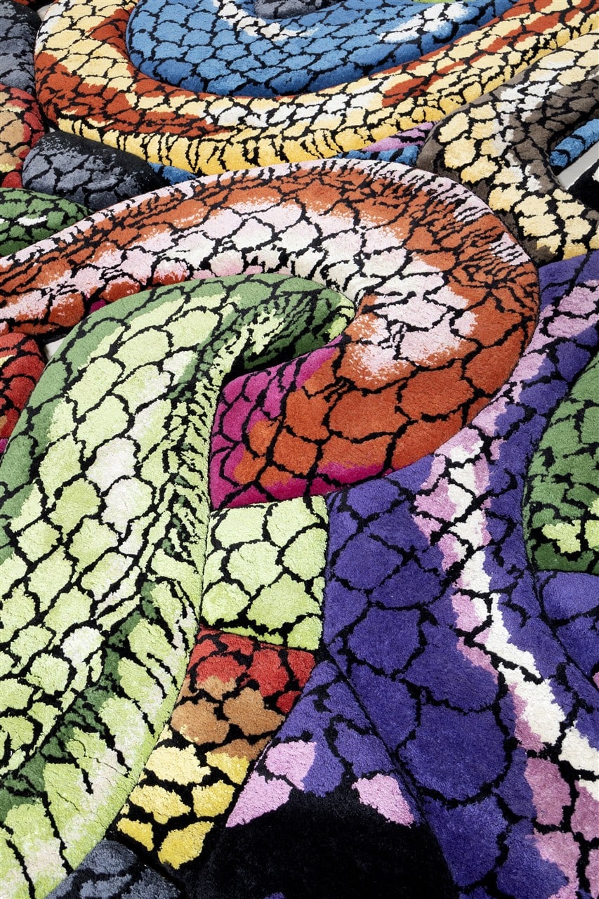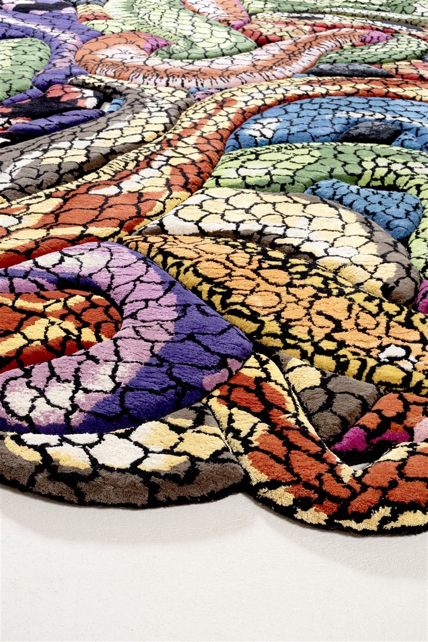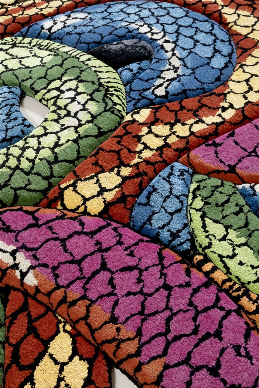 “This rug is a deeply personal creation. Every line and curve of the multicolored snakes is a reflection of my journey: of the mountains I’ve climbed, the battles I’ve endured and the transformations that have shaped me. The snake has been a recurring motif and source of inspiration for me since 2021 — the ancient symbol of rebirth and healing; always shedding, always renewing. Each snake in the rug is a reminder of my own resilience and of those moments when I didn’t think I could rise, but I found the strength to do so. I wanted this piece to feel alive, like a landscape in which you could get lost. Each snake winds through the next, creating intertwined undulations of vibrant color and movement. I intended it to be not just an artwork, but an experience, too — a journey through layers of hardship, renewal, and growth. A quiet reminder that even in our darkest depths, there lies the promise of regeneration.” – Rich Mnisi